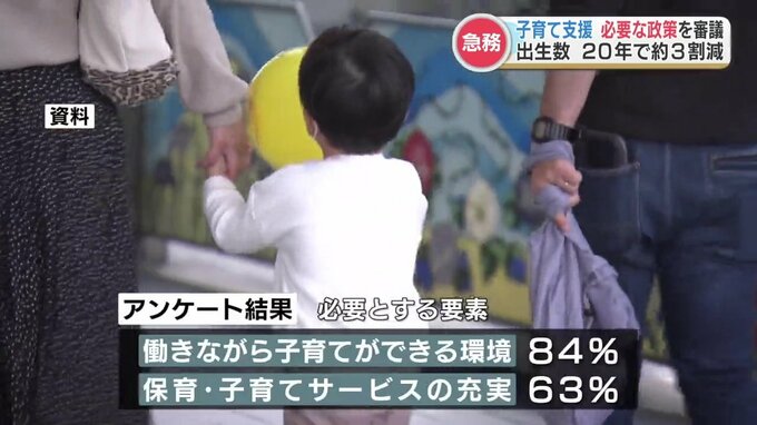 会議では、子育て世帯が求めることのアンケート結果として、働きながら子育てができる環境が84%。保育・子育てサービスの充実が63%だったことが紹介されました。