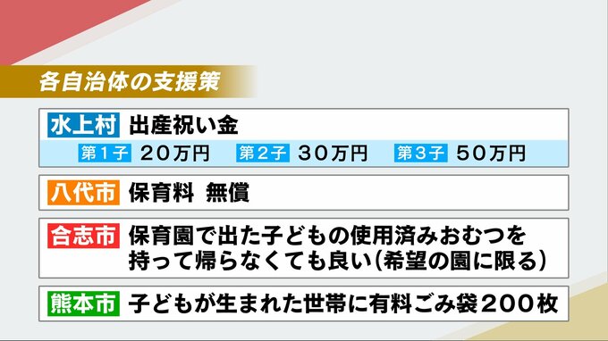 水上村は出産に対し祝い金があり、また八代市は保育料を無償にしています。合志市には、おむつの処理に関する支援もあります。