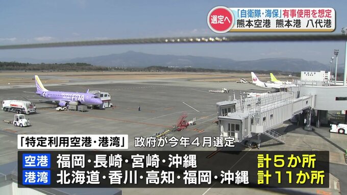 有事の際に自衛隊や海上保安庁が利用する『特定利用空港・港湾』として「熊本空港・熊本港・八代港」を選定へ 2024年6月13日(木) 19:41 国内 有事の際などに自衛隊や海上保安庁が利用する施設として、国が熊本空港や熊本港などを選定する方向で調整を進めていることが明らかになりました。『特定利用空港・港湾』の選定は自衛隊や海上保安庁が、平時の訓練…