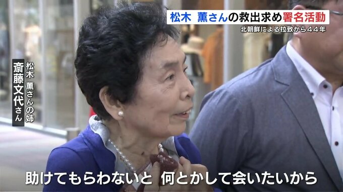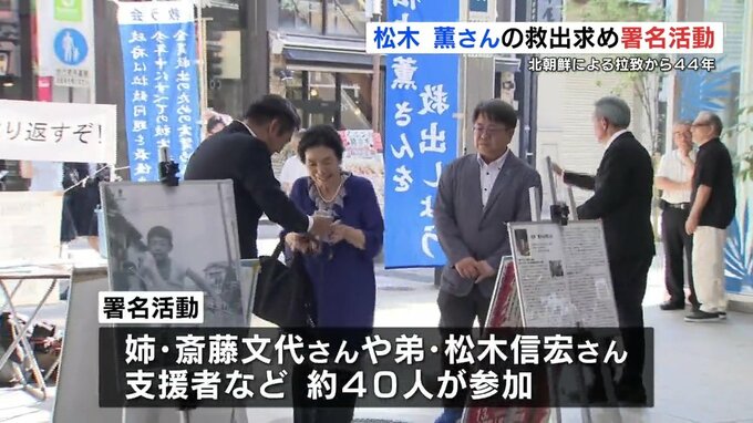 その日に合わせて行った署名活動には、姉の斎藤文代(さいとう ふみよ)さんや、弟の松木信宏(まつき のぶひろ)さんなど約40人が参加して、松木さんの早期救出のための署名を求めました。