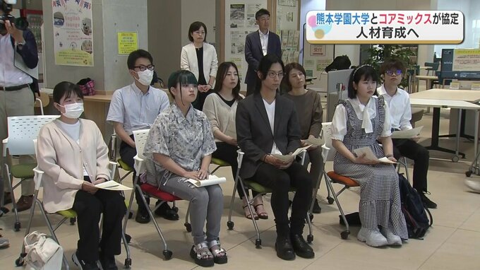協定では、コアミックスの幹部が大学で講義を行うことや、漫画家を目指してアメリカやインドなどから来日して熊本にあるコアミックスの第2本社で研修をする人たちに、学生が日本語のサポートなどをすることを盛り込みました。