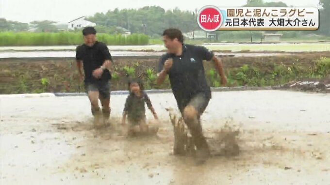 ラグビー元日本代表の2人が熊本県玉名市を訪れ、園児たちと田植えやラグビーを楽しみました。