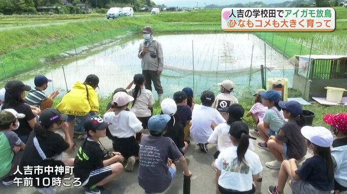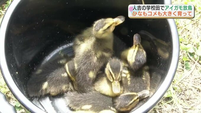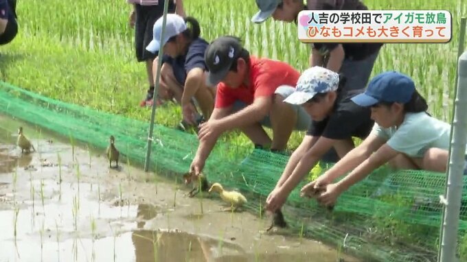 熊本県人吉市の中原小学校で、児童が田植えをした水田にアイガモのひな6羽が放されました。