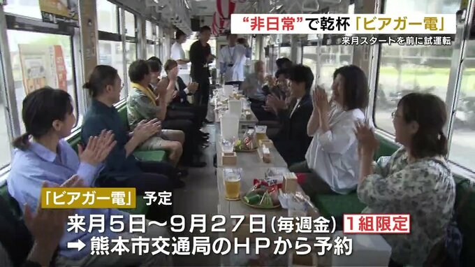 “非日常”で乾杯!「ビアガー電」来月から運行予定 2024年6月22日(土) 11:03 国内 熊本市電の中でビールを飲むことができる貸し切り電車が、7月から運行されるのを前に試運転が行われました。今年で13回目を迎えるこの『ビアガー電』。コースは、交通局を出発して熊本駅前へと向かい、休憩をはさ…