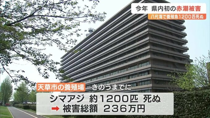 八代海で今年初の赤潮被害 天草市でシマアジ1200匹死ぬ 熊本 2024年6月23日(日) 17:18 国内 熊本県天草市の八代海で、養殖の魚1200匹が赤潮の影響で死ぬ被害が出ました。熊本県内で赤潮被害が出たのは、今年初めてです。熊本県によりますと、八代海にある天草市の養殖場できのうまでに1200匹のシマアジが死…