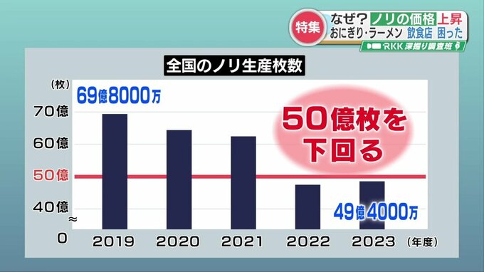 さらに、ノリ生産者の後継者不足もジワリと影響しています。昨年度、全国のノリの生産量は約49億4000万枚。2年連続で50億枚を割りました。