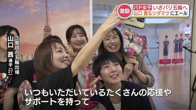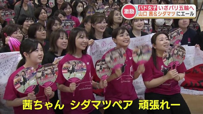 バドミントン女子シングルスで3大会連続の出場となる山口茜(やまぐち あかね)選手(27)、女子ダブルスで初めてのオリンピックに臨む志田千陽(しだ ちはる)(27)・松山奈未(まつやま なみ)(25)ペアに、応援メッセージが書かれた国旗や千羽鶴が手渡されました。