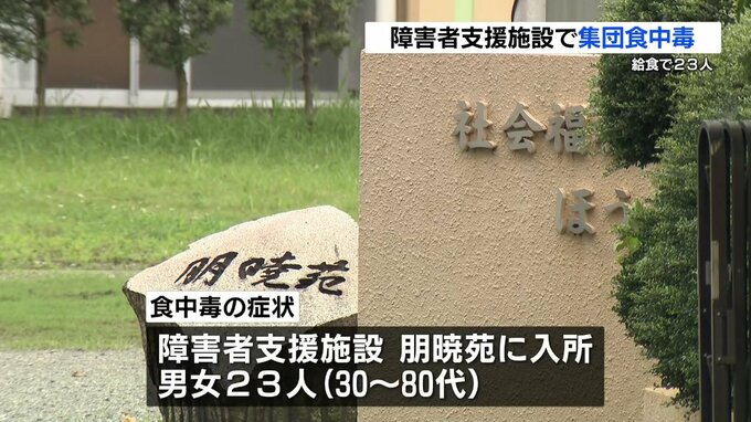 障害者支援施設で集団食中毒 23人に症状 給食が原因 2024年6月29日(土) 17:58 国内 熊本市内の障害者支援施設で入所者23人が食中毒の症状を訴えていたことが明らかになりました。食中毒の症状が出たのはいずれも障害者支援施設「朋暁苑(ほうぎょうえん)」に入所している30代から80代の男女23人で…