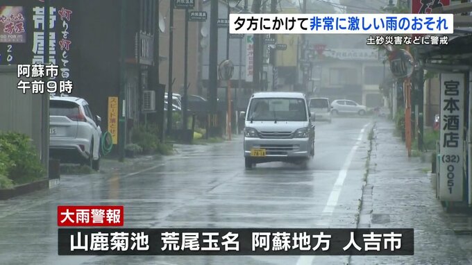 現在、大雨警報が山鹿菊池(やまが・きくち)と荒尾玉名(あらお・たまな)、阿蘇(あそ)地方、人吉(ひとよし)市に発表されています。※1日午前11時半現在