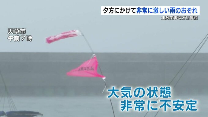 対馬海峡付近に停滞する梅雨前線に向かって暖かく湿った空気が流れ込み、大気の状態が非常に不安定となっています。県内は、これから夕方にかけてが雨のピークで、熊本地方と阿蘇地方では局地的に1時間に70ミリの非常に激しい雨が降るおそれがあります。