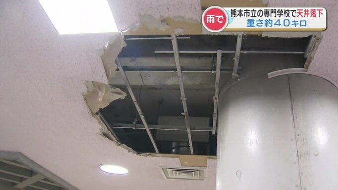 市立学校で天井落下事故 “重さ40キロ” の石膏ボード 雨漏りが原因か 熊本 2024年7月1日(月) 19:17 国内 熊本市立総合ビジネス専門学校(熊本市西区、学生数116人)で、校舎の天井が落下する事故がありました。けが人はいませんでした。記者「落下したのは、生徒たちが行き交う階段のすぐ上にある天井板です」学校により…