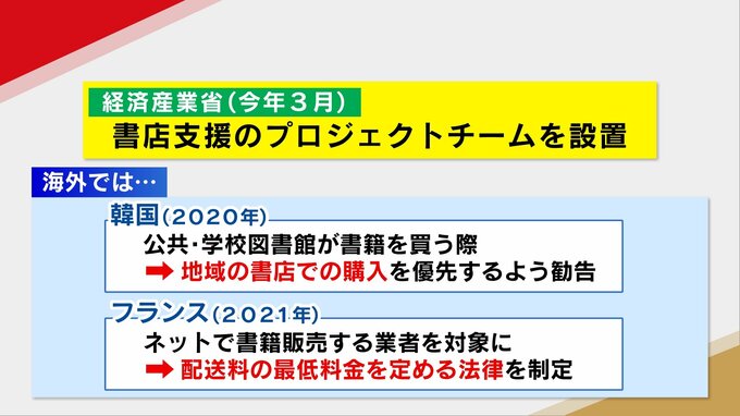 韓国では学校図書館などの公共施設が書籍を買う際は、地域の書店での購入を優先するよう勧告。また、フランスではネットで書籍を販売する業者に対し、配送料の最低料金を定める法律を制定しました。