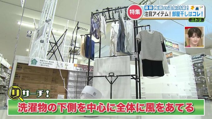 ライオン お洗濯マイスター 大貫和泉さん「洗濯物は上から乾いていき、下が一番乾きにくい。洗濯物の下側を中心に、全体に風が当たるように首振りで使うとよい」