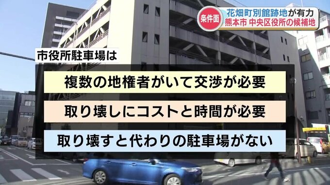 また、現在は本庁舎と同じ建物にある中央区役所については、本庁舎と別に建てる案を示し、候補地として花畑町別館跡地と現在の熊本市役所駐車場の2か所をあげています。