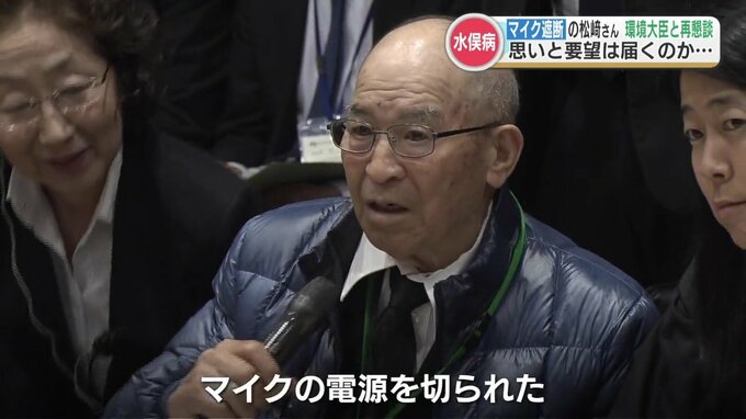 松﨑さんは2か月前の伊藤大臣との懇談で、水俣病の症状を訴えながら亡くなった妻・悦子(えつこ)さんへの思いを語っている途中、職員によってマイクの音量を絞られました。