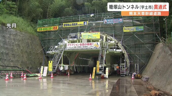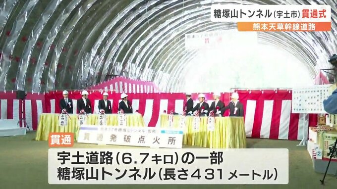 今回新たに貫通したのは、宇土市を通る6.7キロの宇土道路の一部、長さ431メートルの糖塚山(ぬかつかやま)トンネルで、去年3月に着工し来年2月末に完成予定です。
