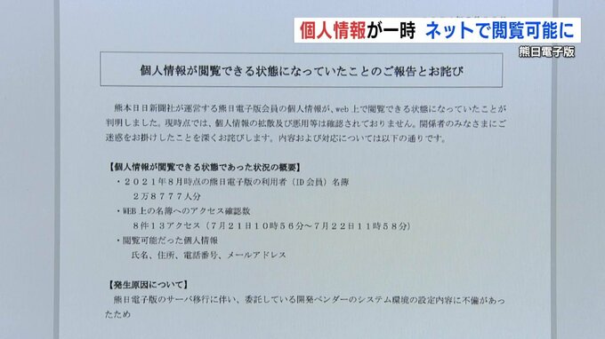 個人情報が閲覧できる状態になっていたのは、2021年8月時点で熊日電子版に登録していた2万8777人分の氏名や住所、電話番号などです。会員からの指摘で発覚しました。