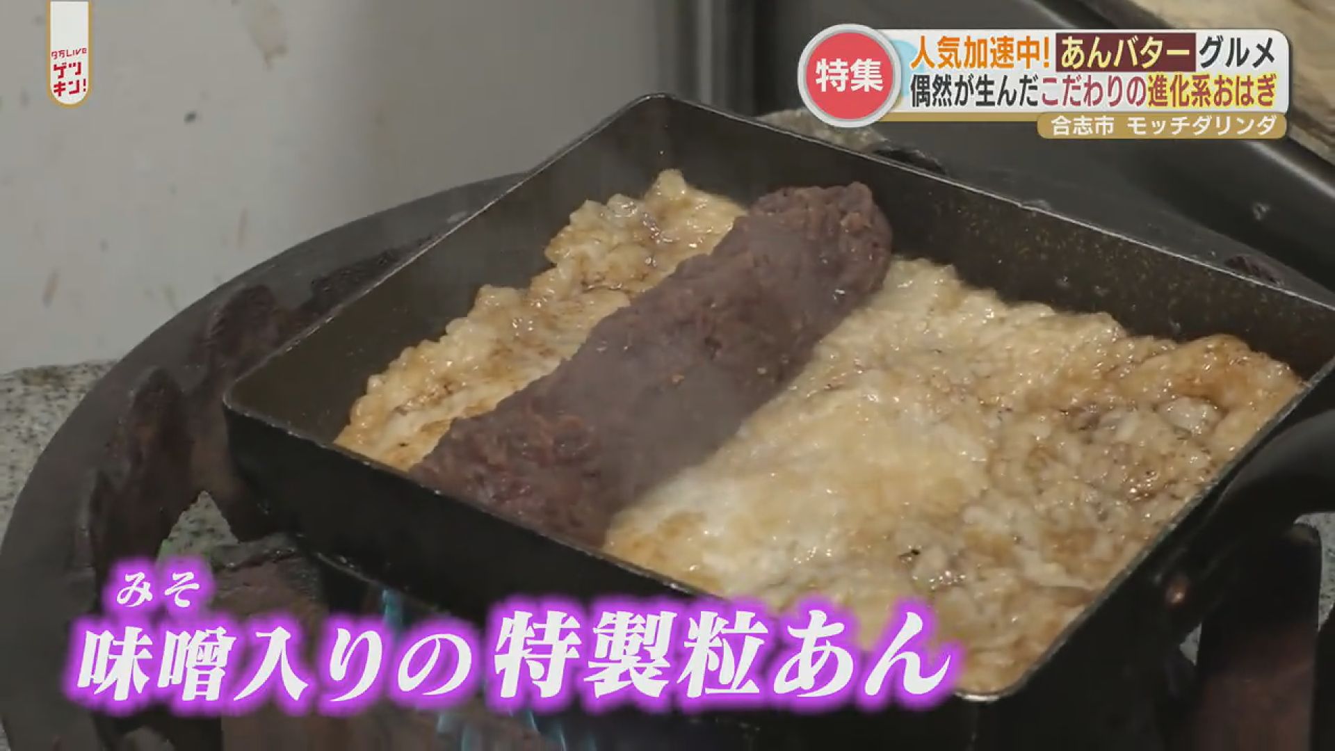 思いついて始めた商品だったのですが、かかる手間はおはぎの数倍。まず、熱したフライパンにバターを溶かしおはぎ用の米を薄く敷いて焼きます。そこへ味噌を混ぜん込んだ「特製粒あん」を投入。卵焼きのように巻いていきます。