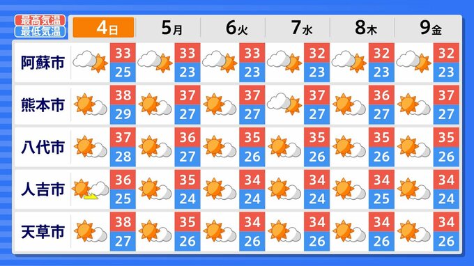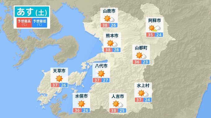 3日も暑さは続き、最高気温は熊本市・山鹿市・人吉市で38℃、天草市・八代市・水上村で37℃と予測されるなど、きょうを上回る暑さとなる恐れがあります。