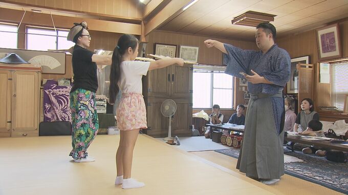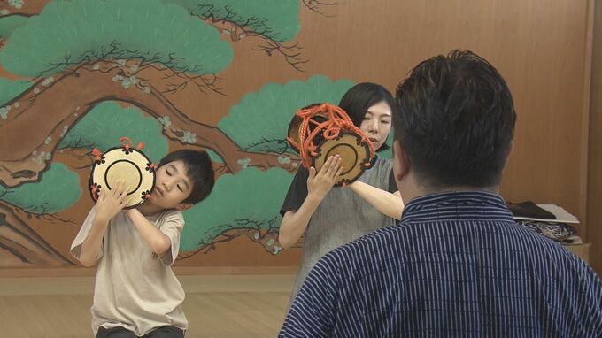 熊本では高齢化などで能楽師は減っていて、夏休みの子どもや大人に能の魅力を知ってもらおうと初めて企画。8歳から60代までの12人が受講し、8月8日は小鼓方の飯冨孔明(いいとみ よしあき)さんが、小鼓や仕舞などを教えました。
