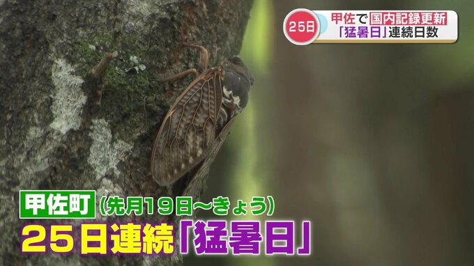 猛暑日“25日連続” 全国の最長記録更新 熊本・甲佐町 2024年8月12日(月) 19:00 国内 この夏の暑さは記録的です。熊本県甲佐町(こうさまち)では、全国で最も長い猛暑日の連続記録を更新しました。「甲佐町に来ています。時刻は午後2時で、手元の温度計で37.6℃を記録しています。立っているだけで…