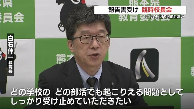 高1自殺「上級生によるいじめ」認定 部活動の『理不尽なルール』のチェックなどを各校長に指示 熊本 2024年8月26日(月) 12:21 国内 2022年に熊本県立熊本工業高校の生徒が自殺したことは「いじめが原因の可能性が高い」とする第三者委員会の報告書を受け、8月26日に県教育委員会が臨時の会議を開きました。オンラインで行われた臨時の校長会には…