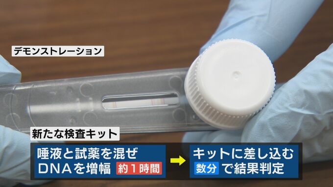 採取した唾液を試薬と混ぜ、1時間ほどかけてDNAを増幅、取り出したものをキットに差し込むと、数分で結果が出る仕組みです。