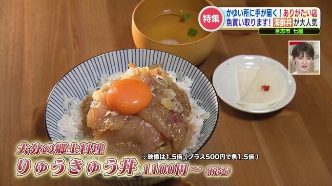 名物は、大分の郷土料理「りゅうきゅう丼」。新鮮な魚を特製ダレにしっかりと漬け込み、すり胡麻で香ばしさを引き立てた刺身は、ご飯との相性も抜群です!