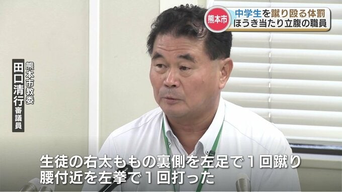 ほうきが足に当たった「怒り」で体罰 中学校職員が生徒を蹴る・殴る 市教委が処分検討 熊本市 2024年9月19日(木) 19:01 国内 熊本市の中学校に勤務する職員による、生徒への体罰が明らかになりました。熊本市教育委員会 田口清行審議員「生徒の右太ももの裏側を左足で1回蹴り、腰付近を左拳で1回打った」熊本市教育委員会によりますと、…
