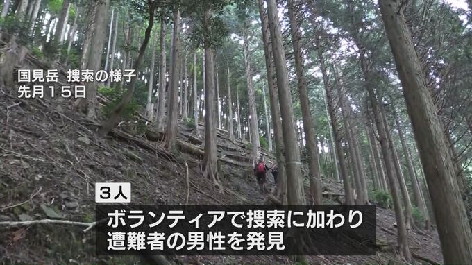3人は先月16日ボランティアで捜索に加わり、遭難者の男性を発見した後は河野さんが介抱する一方、天本さんが尾根まで登って携帯電話で救助を求めたという事です。