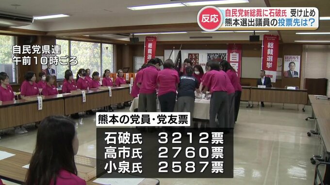 27日午前に開票された熊本県内の党員・党友票は、石破氏が最も多く3212票、高市氏が2760票、小泉進次郎(こいずみ しんじろう)氏が2587票で続きました。