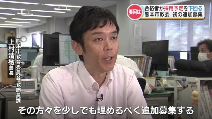 熊本市教育委員会 教職員課 上村清敬課長「最終的に2次の合格者数が262人と52人不足しましたので、その方々を少しでも埋めるべく追加募集させていただきたい」