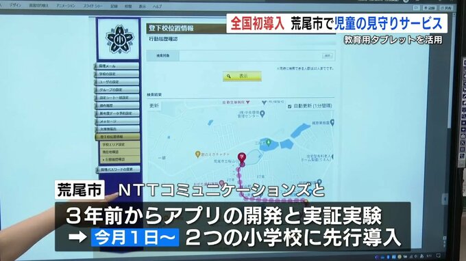 荒尾市が全国で初めて導入した見守りサービスは、児童に配布した教育用タブレットのアプリで「登下校の状況」や「現在地」のほか、「行動履歴」などを保護者が把握できるものです。