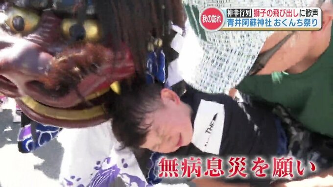 無病息災を願って 獅子がガブリ「おくんち祭」2000人の神幸行列 熊本・人吉市 2024年10月9日(水) 19:21 国内 熊本県人吉市の青井阿蘇神社で「おくんち祭」のハイライト、神幸行列が行われました。神幸行列は10月9日午前10時、本神輿が厳かに境内を出発しました。縁起物の獅子たちも勢いよく後に続きます。57団体2000人が参…