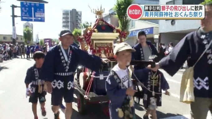 神幸行列は10月9日午前10時、本神輿が厳かに境内を出発しました。縁起物の獅子たちも勢いよく後に続きます。
