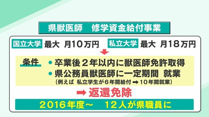 国立大学の場合 月に10万円が給付され(私立大学は月18万円)一定期間 県の獣医師として働くなど条件を満たすと、返還が免除されます。