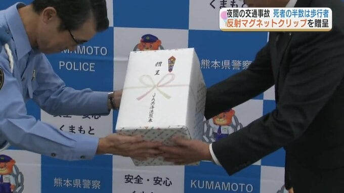 歩行者が巻き込まれる夜間の交通事故を防ごうと、JA共済が熊本県警に反射マグネットクリップを贈呈しました。