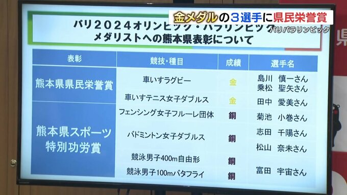 また、県はパリ五輪で銅メダルを獲得したフェンシングの菊池小巻(きくち こまき)選手、バドミントンの志田千陽(しだ ちはる)選手、松山奈未(まつやま なみ)選手、パラ競泳の富田宇宙(とみた うちゅう)選手の4人には、県スポーツ特別功労賞を贈呈するということです。