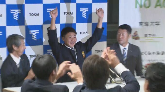 東海大九州農学部からの指名は、史上初の快挙です。東海大学阿蘇くまもと臨空キャンパスでは指名の瞬間を待っていた野球部員たちから歓声が沸き上がり、廣池投手も両手を高くあげ、喜びをあらわにしました。