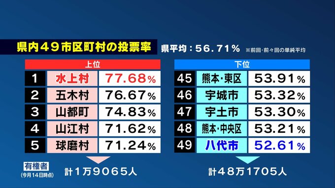 では、県内49の市区町村ではどうなのか?直近2回の衆院選の平均から比較すると、1位は水上村、最下位は八代市でした。群部が上位に、都市部が下位に並ぶ傾向があるようです。