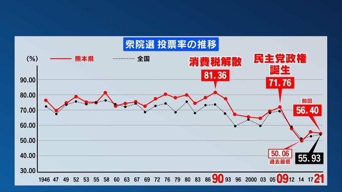 ちなみに県内の過去最高は1990年の81.36%。前の年に初めて導入された消費税の是非を問うもので、「消費税解散」選挙と名付けられました。2000年以降だと、2009年の自民党から民主党に政権交代した選挙で71.76%となりました。