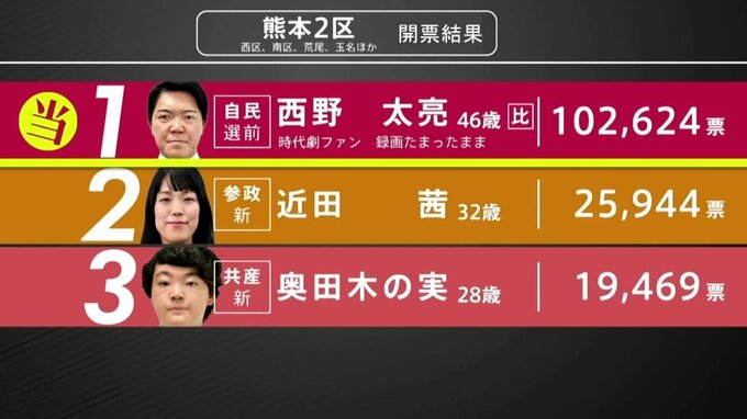 当選した 自民・前職 西野太亮氏「時には大胆に勝負できる、度胸のある政治家になっていきたいと思います。その政治家を目指して、その先に私が目指す日本、そしてふるさと熊本。持続可能な発展。これを目指して日々精進を重ねていきたいと思います」
