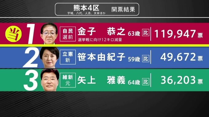 熊本4区、自民党・前職の金子恭之(かねこ やすし)氏が12万票近くを獲得し、新人と元職との戦いを制しました。