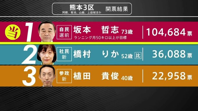 熊本3区も自民党・前職の坂本哲志(さかもと てつし)氏が安定した戦いを見せ、当選を果たしました。