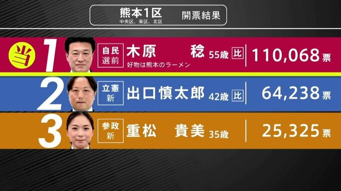 熊本1区は自民党前職の木原稔(きはら みのる)氏が強固な組織戦を展開し、新人2人を退けました。