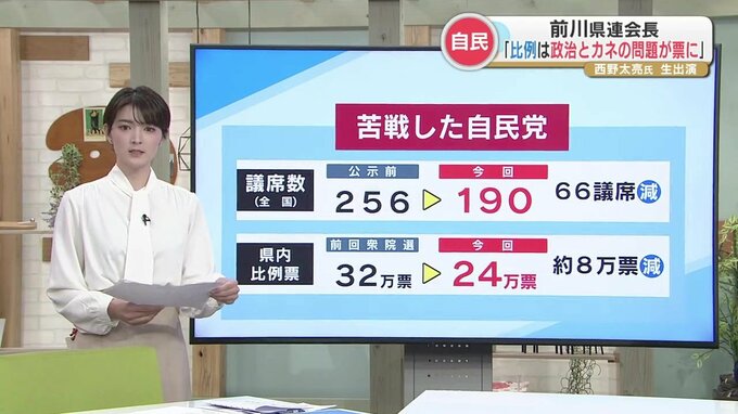 熊本では自民党が4つの小選挙区を全て獲得。一方で全国的には256議席から190議席と、議席を大きく減らす結果となりました。また熊本の比例票も前回の衆院選から8万票ほど減少しています。