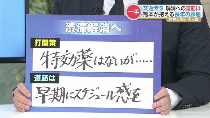 西野太亮氏「がっかりされるかもしれませんが、特効薬というものはないと思います。最新のデータでは熊本市内だけで174の主要渋滞箇所がありますが、一気にゼロに減らすことは難しい。信号機の時間配分の見直しや右折レーンを作ること、公共交通機関の充実など、どこの渋滞がひどいのか?原因は何か?ということを分析して、政策を積み上げることが重要です」
