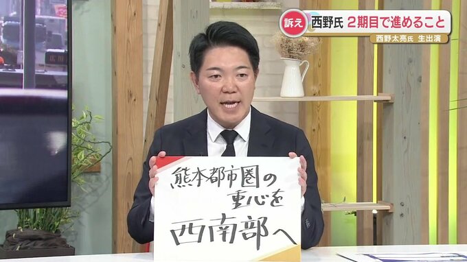 西野太亮氏「私が熊本2区の選出議員だから言っているわけではなくて、東部・北部にお住いの皆さまにとっても、今あまりにも熊本都市圏の重心が東側に偏っているので、熊本都市圏の機能がまひしてしまうかもしれない。その重心を西南部に移すことによって、西南部の皆さまだけでなく、東部・北部の皆さまにとっても非常に大きなメリットがあると思っています。そのためしっかり取り組んでいきたい」