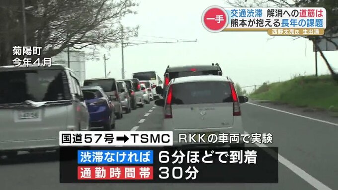 TSMCが進出した菊陽町でも渋滞は深刻です。朝の通勤時間帯の菊陽町、国道57号は慢性的に渋滞しています。渋滞がなければ6分ほどで到着するTSMCの工場まで、30分かかりました。