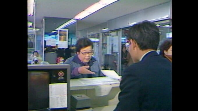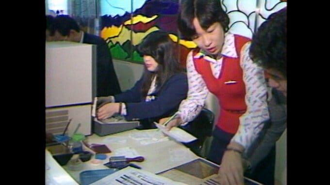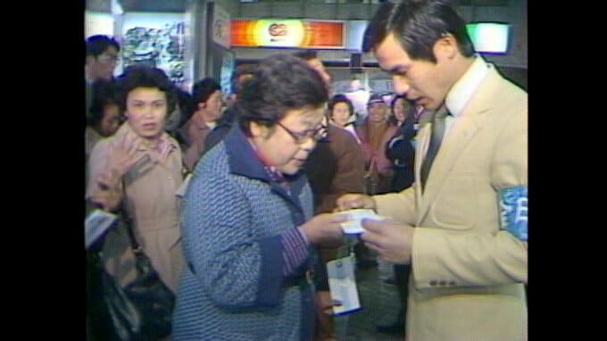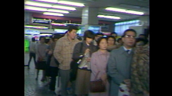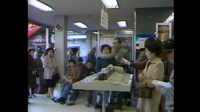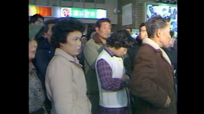 昭和56年(1981)12月、航空会社の予約センターに長い行列ができています。